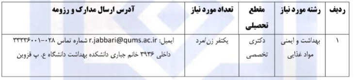 به اطلاع می رساند، دانشگاه علوم پزشکی قزوین، جهت تامین نیازهای آموزشی خود از بین فارغ التحصیلان در رشته تحصیلی بهداشت و ایمنی مواد غذایی، به صورت هیات علمی متعهد خدمت، دعوت به همکاری می نماید.