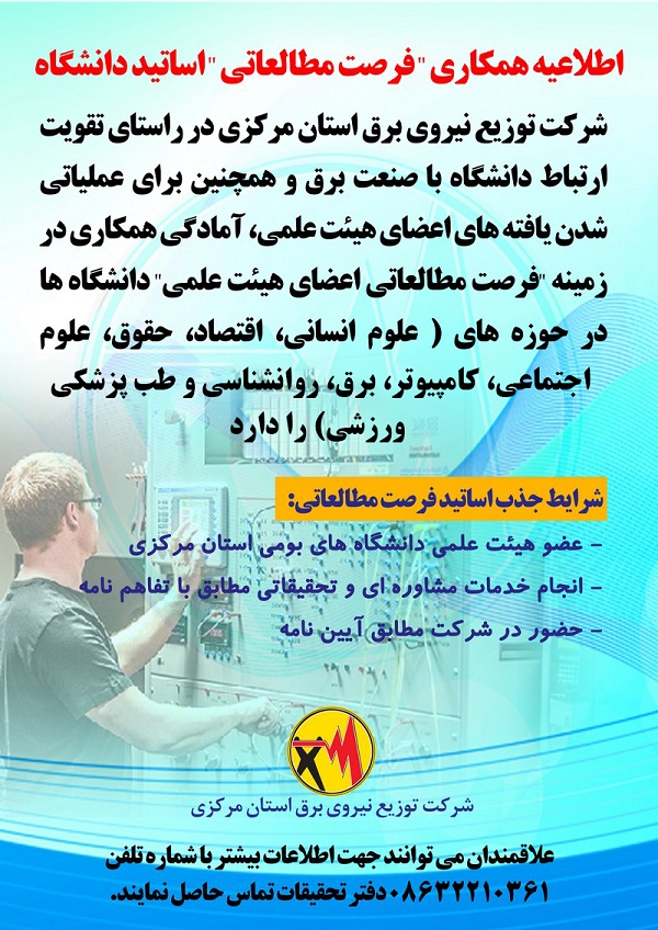 اطلاعیه شرکت توزیع نیروی برق استان مرکزی در راستای همکاری فرصت مطالعاتی اساتید دانشگاه به پیوست می باشد.