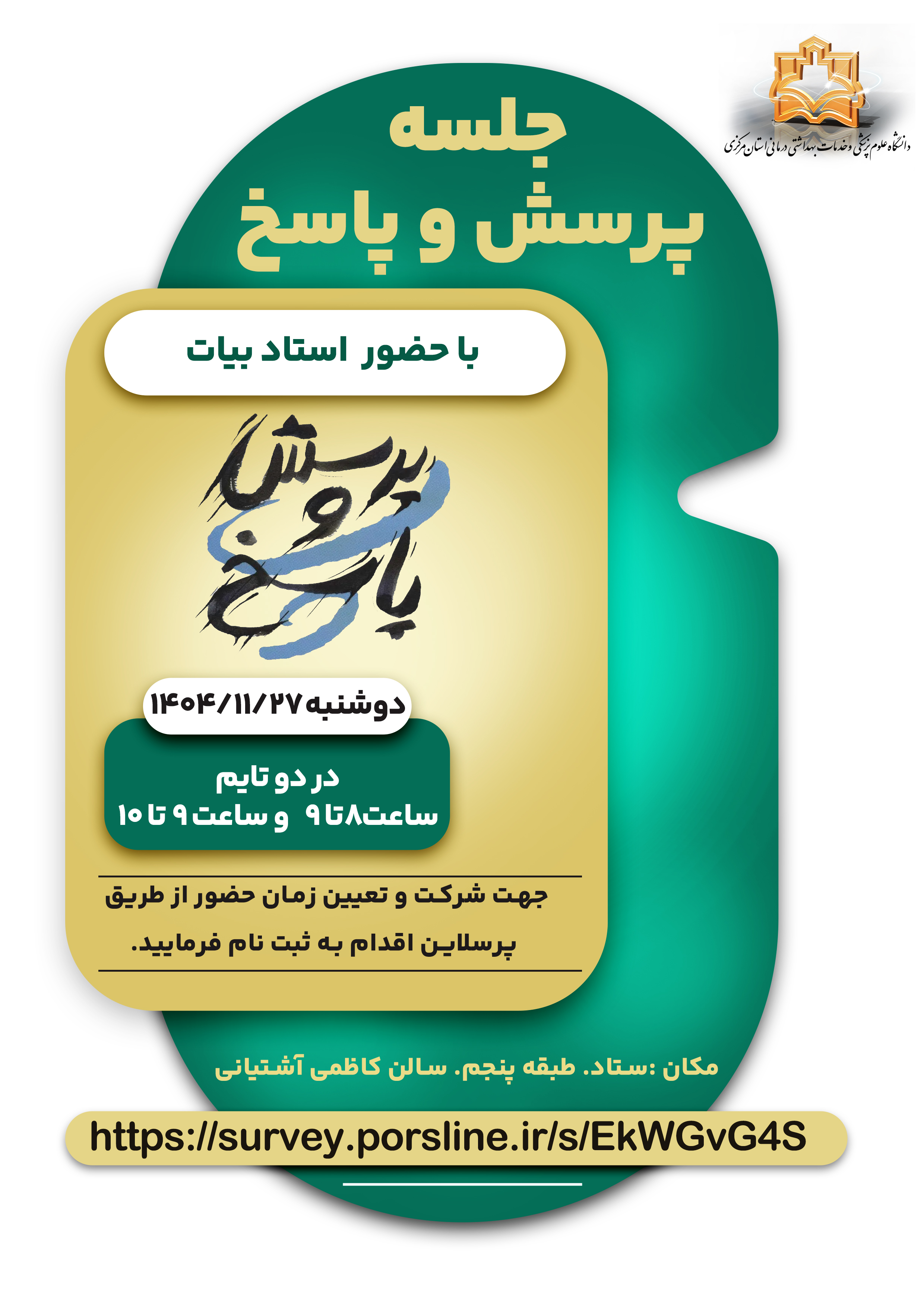جلسه پرسش و پاسخ ۲۶ بهمن ۱۴۰۴ | ۱۱:۱۴ کد : ۵۸۰۰۷ اطلاعیه ارسال به دیگران نام شما ایمیل شما ایمیل دریافتکننده ارسال انصراف تعداد بازدید:۱۳۵ جلسه پرسش و پاسخ، با حضور استاد بیات برگزار می گردد.