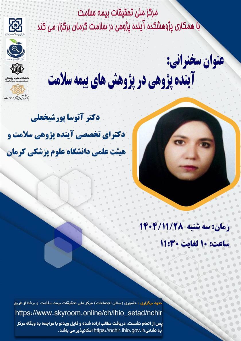 نشست علمی - تخصصی آینده پژوهی در پژوهش های بیمه سلامت ۲۶ بهمن ۱۴۰۴ | ۱۲:۱۹ کد : ۵۸۰۱۲ اطلاعیه ارسال به دیگران نام شما ایمیل شما ایمیل دریافتکننده ارسال انصراف تعداد بازدید:۹۸ نشست علمی - تخصصی آینده پژوهی در پژوهش های بیمه سلامت